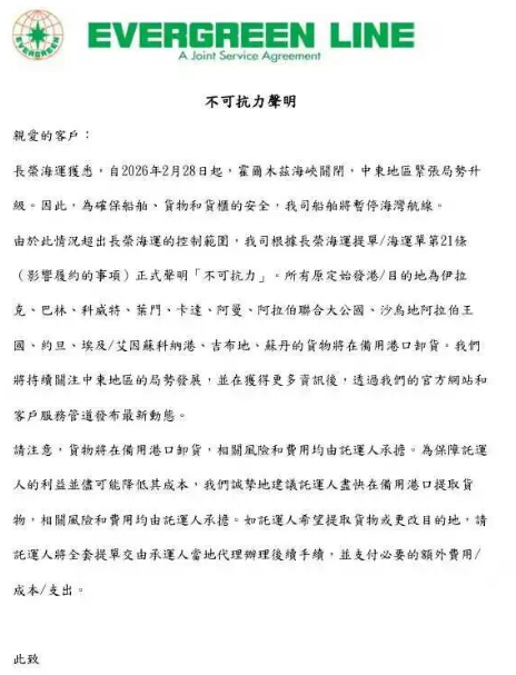 长荣海运公告:所有中东在途货物备用港卸货,费用、风险客户承担 2026.03.10