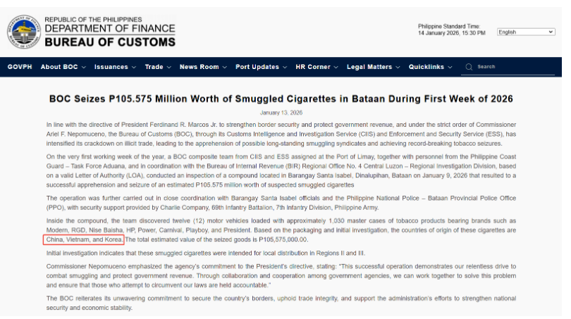 菲海关查获大量疑似走私香烟!来自中国、越南和韩国 2026.01.16
